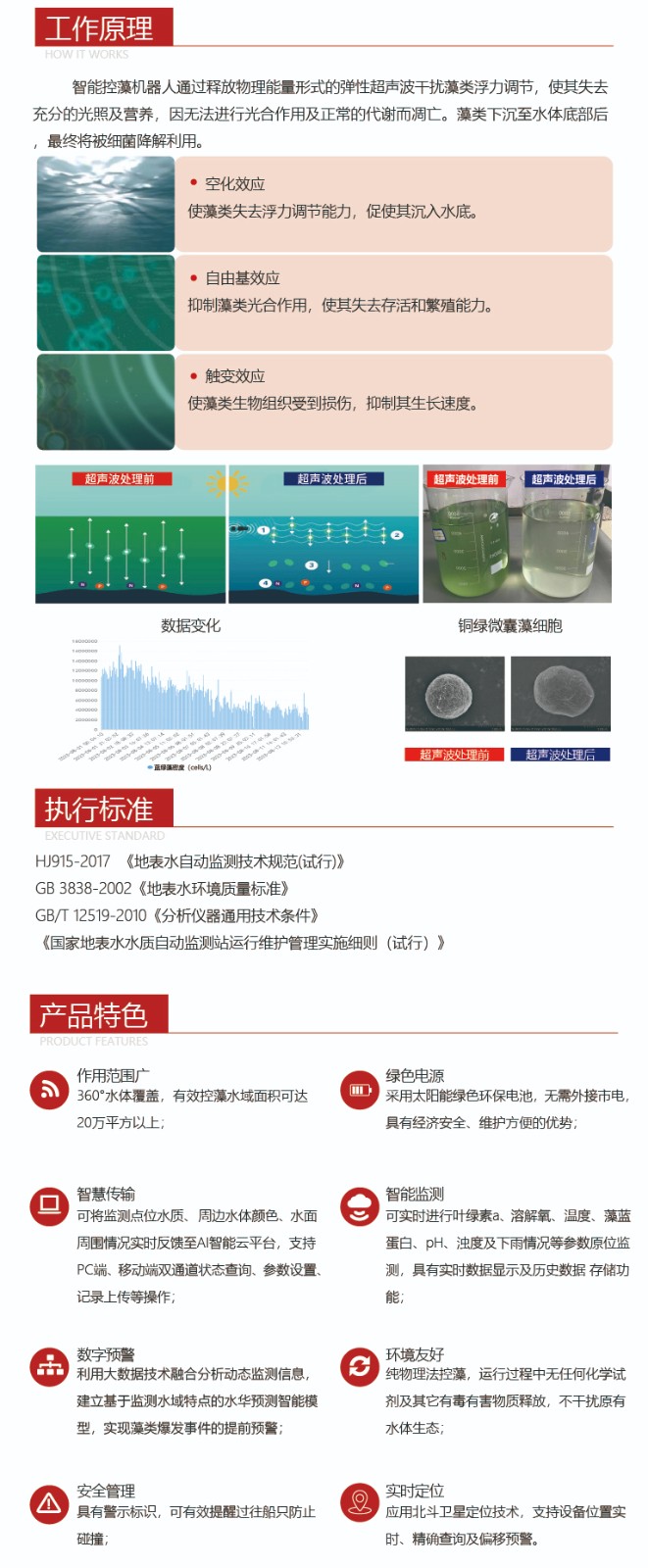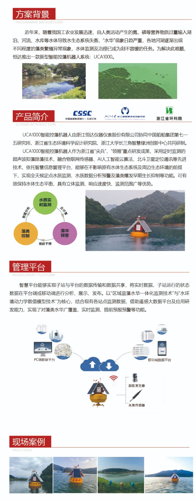 UCA1000智能控藻機(jī)器人由浙江恒達(dá)儀器儀表股份有限公司協(xié)同中國(guó)船舶集團(tuán)第七一 五研究所、浙江省生態(tài)環(huán)境科學(xué)設(shè)計(jì)研究院、浙江大學(xué)長(zhǎng)三角智慧綠洲創(chuàng)新中心共同研制。 UCA1000智能控藻機(jī)器人作為浙江省“尖兵”、“領(lǐng)雁”重點(diǎn)研發(fā)成果,采用定時(shí)監(jiān) 測(cè)的超聲波抑藻除藻技術(shù),融合物聯(lián)網(wǎng)傳感器、AI人工智能云算法、北斗衛(wèi)星定位通訊等 先進(jìn)技術(shù),依托智慧信息管理平臺(tái),能夠在不影響原有水體生態(tài)系統(tǒng)及周邊生態(tài)環(huán)境的前 提下,實(shí)現(xiàn)全天候定點(diǎn)水質(zhì)監(jiān)測(cè)、水質(zhì)數(shù)據(jù)分析預(yù)警及藻類爆發(fā)早期生長(zhǎng)抑制等功能???有效保持水體生態(tài)平衡,具有立體監(jiān)測(cè)、響應(yīng)速度快、監(jiān)測(cè)范圍廣等優(yōu)勢(shì)。 |
